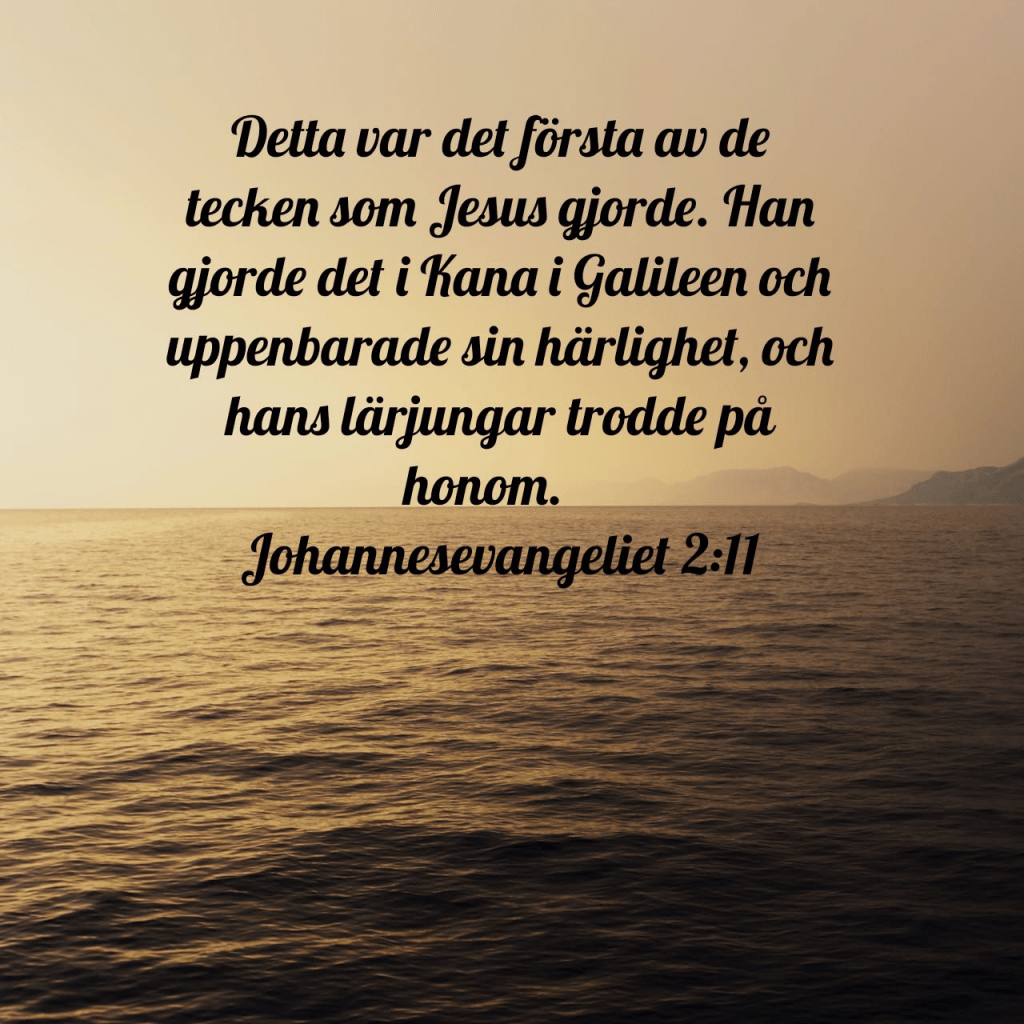 På tredje dagen var det bröllop i Kana i Galileen, och Jesu mor var där. Jesus och hans lärjungar blev också bjudna till bröllopet. När vinet tog slut sade Jesu mor till honom: ”De har inget vin.” Jesus svarade: ”Kvinna, vad har vi med det att göra? Min stund har ännu inte kommit.” Hans mor sade till tjänarna: ”Gör vad han än säger till er.” Nu stod där sex stenkrukor, sådana som judarna använder vid sina reningar. De rymde omkring hundra liter var. Jesus sade: ”Fyll krukorna med vatten!” Och de fyllde dem ända till brädden. Sedan sade han: ”Ös nu upp och bär in det till värden.” Och de gjorde det. Värden smakade på vattnet, som nu hade blivit vin, och han visste inte varifrån det kom. Men tjänarna som hade öst upp vattnet visste det. Värden kallade därför på brudgummen och sade: ”Varenda människa sätter först fram det goda vinet, och det som är sämre när gästerna börjar bli druckna. Du har sparat det goda vinet ända till nu.” Detta var det första av de tecken som Jesus gjorde. Han gjorde det i Kana i Galileen och uppenbarade sin härlighet, och hans lärjungar trodde på honom.